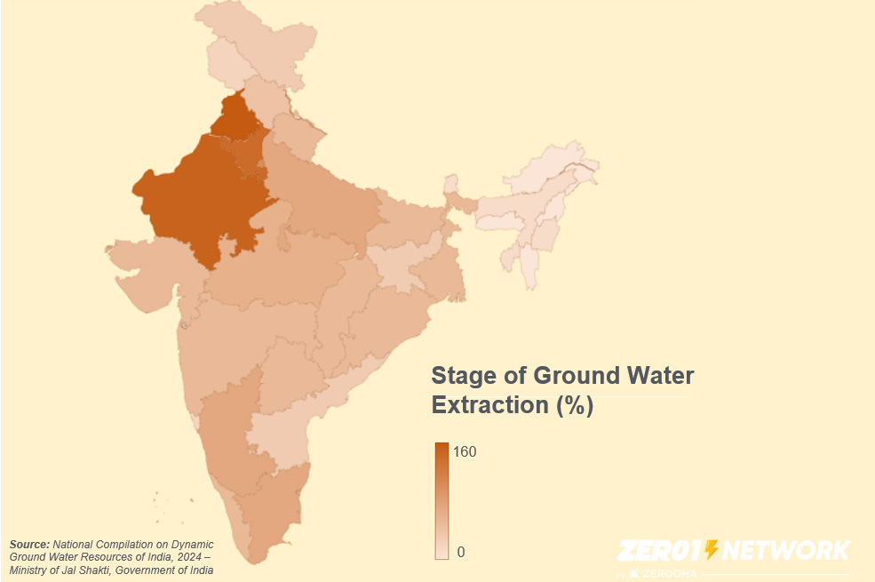 In the breadbasket states of Punjab, Haryana, and Rajasthan, farmers are pumping over 100% of the annual replenishable groundwater – in Punjab it's an astonishing ~157%. In plain terms, these regions are using far more water than nature puts back, year after year.